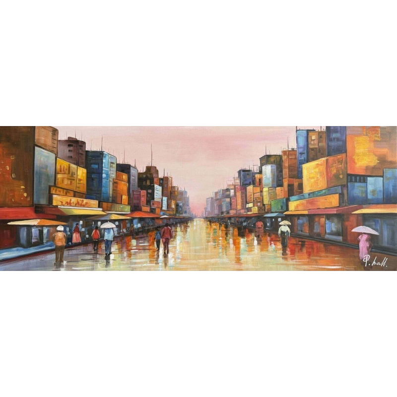 Toutes nos peintures sont peintes à la main avec de la peinture à l'huile, ce qui donne une belle profondeur à la peinture. Nos tableaux sont montés sur des cadres de stores en bois et montés sur des modules suspendus, de sorte qu'ils soient prêts à être accrochés au mur.