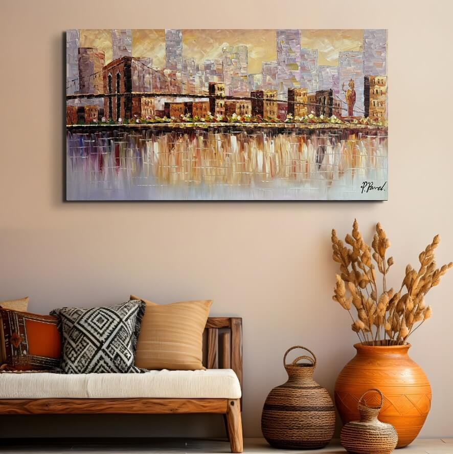 Toutes les peintures en vente ici chez Mynewart.fr sont des œuvres peintes à l’huile et à la main. La peinture à l"huile est considérée comme la plus classique. C’est avec l"huile qu"on obtient les couleurs les plus profondes. La livraison est assurée gratuitement par GLS. Vous pouvez suivre votre colis à tout moment par Track & Trace. L’œuvre est expédiée, soigneusement protégée et assurée. Elle est montée sur un cadre d’environ 3,3 cm d’épaisseur et prête à être accrochée au mur. Il suffit de planter un ou deux clous dans le mur.